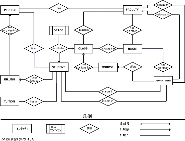GRADES は弱いエンティティです。このエンティティは授業を受ける学生に依存しているので、その存在は他のエンティティの有効性に依存しています。STUDENT テーブルと FACULTY テーブルが共通の情報を作成するのは、学生が教職員になったり、教職員が学生になる場合があるからです。共通の情報は、PERSON テーブルにあります。