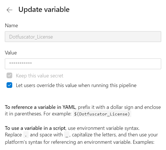 Dotfuscator_License という変数を定義し、その値に Dotfuscator ライセンスキーを設定します。