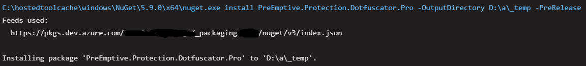 task: NuGetCommand@2 inputs: command: 'custom' arguments: 'install PreEmptive.Protection.Dotfuscator.Pro -OutputDirectory $(Agent.TempDirectory) -PreRelease -x -Source https://pkgs.dev.azure.com/[AzDO Org]/ [AzDO Project]/_packaging/[AzDO Feed]/nuget/v3/index.json' |
