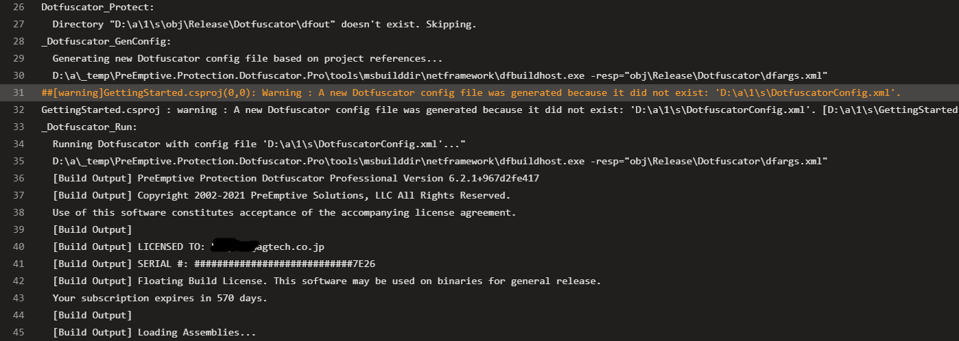 上記の設定が完了し、パイプラインを実行すると Dotfuscator がアプリケーションを保護していることを確認できます。パイプラインのトリガー(サンプルでは該当の master ブランチがプッシュされたとき)を実行してみます。以下、ビルドログを抜粋しています。