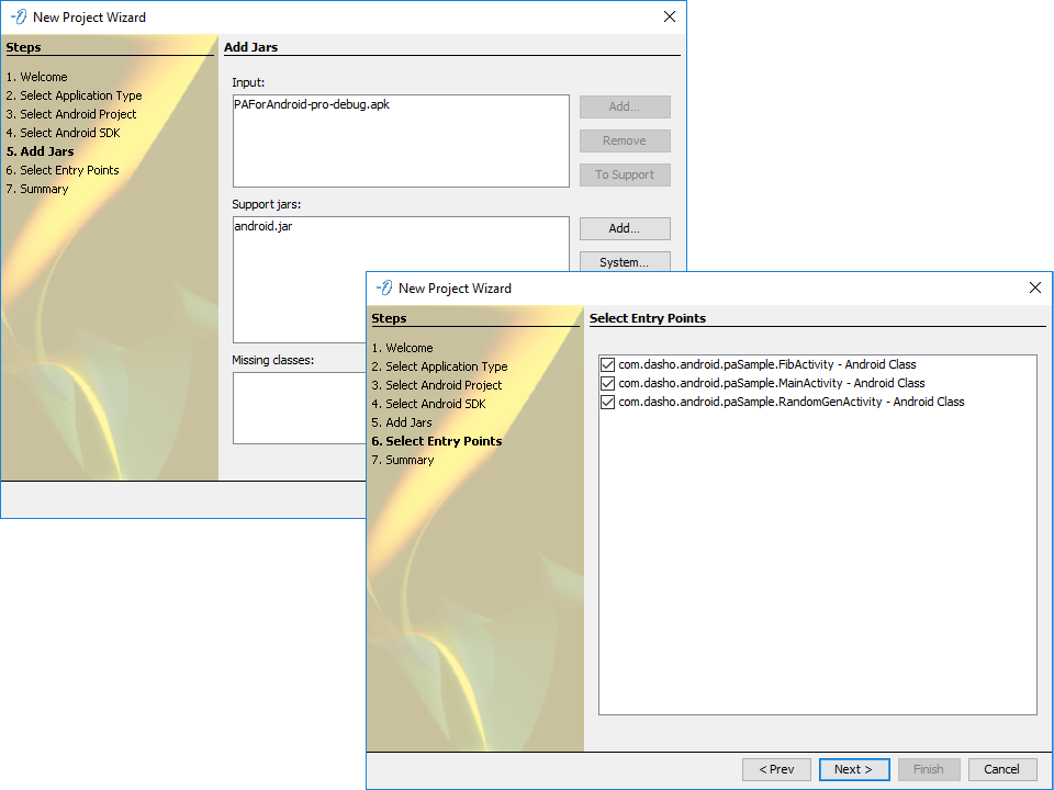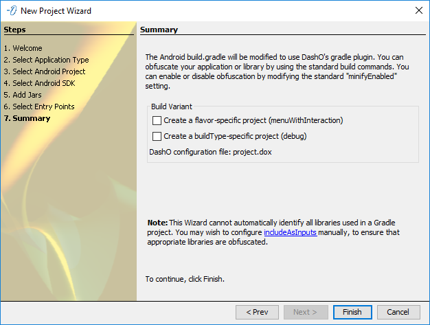 メモ:Android プロジェクトの場合は、ウィザードで、入力として追加の jar ファイルを加えないでください。 DashO の入力として、ライブラリ プロジェクトや他の Gradle 依存関係を含めたい場合は、ウィザードの完了後に、