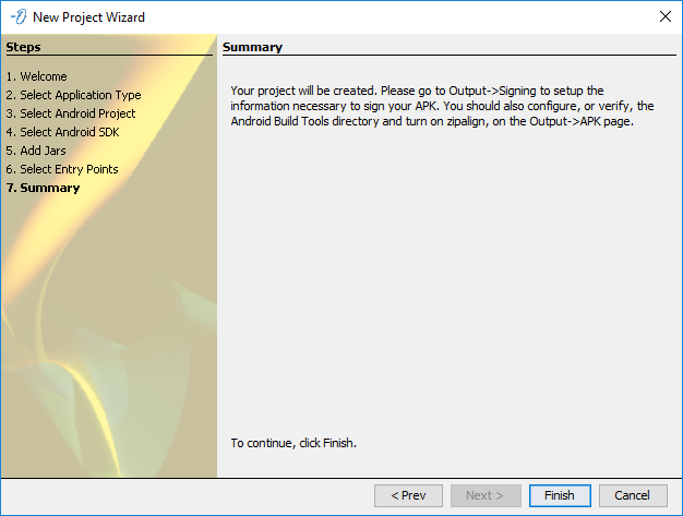 Output – Signing パネルで署名を構成し、Output – APK パネルで Android の Build Tools のディレクトリを設定または検証する必要があります。 この構成に役立つよう、ウィザードは Android SDK のbuild-toolsディレクトリの検出を試みます。