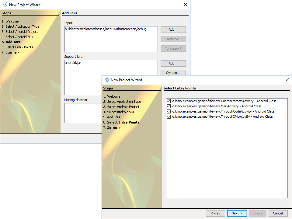 ウィザードは、AndroidManifest.xml、リソース、およびコンパイルされたクラスを分析して、アプリケーションまたはライブラリのエントリ ポイントを決定します。