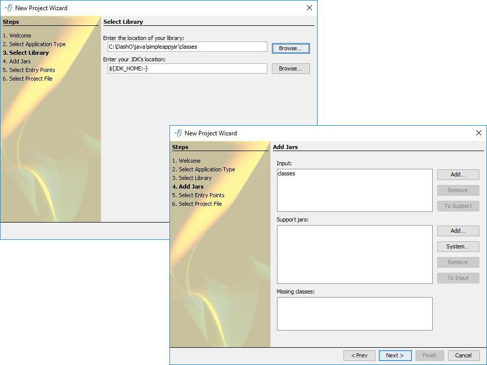 このウィザードでは、難読化する Java ライブラリを選択する際に、そのライブラリが格納されているディレクトリまたは jar ファイルの場所を指定するよう求められるほか、Java ランタイム クラスを解決するために DashO で使用する JDK の場所(Include JDK(JDK の導入)を参照)も指定するよう求められます。