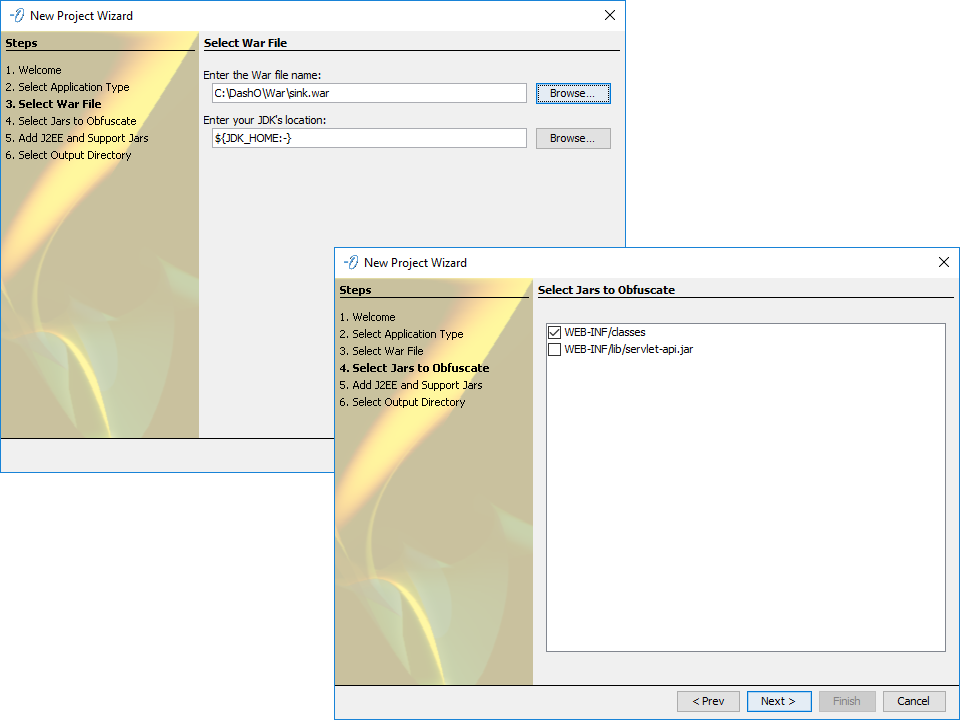 このウィザードでは、難読化する WAR ファイルを選択する際に、WAR ファイルの場所と名前を指定するよう求められるほか、Java ランタイム クラスを解決するために DashO で使用する JDK の場所(Include JDK(JDK の導入)を参照)も指定するよう求められます。