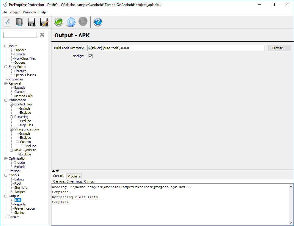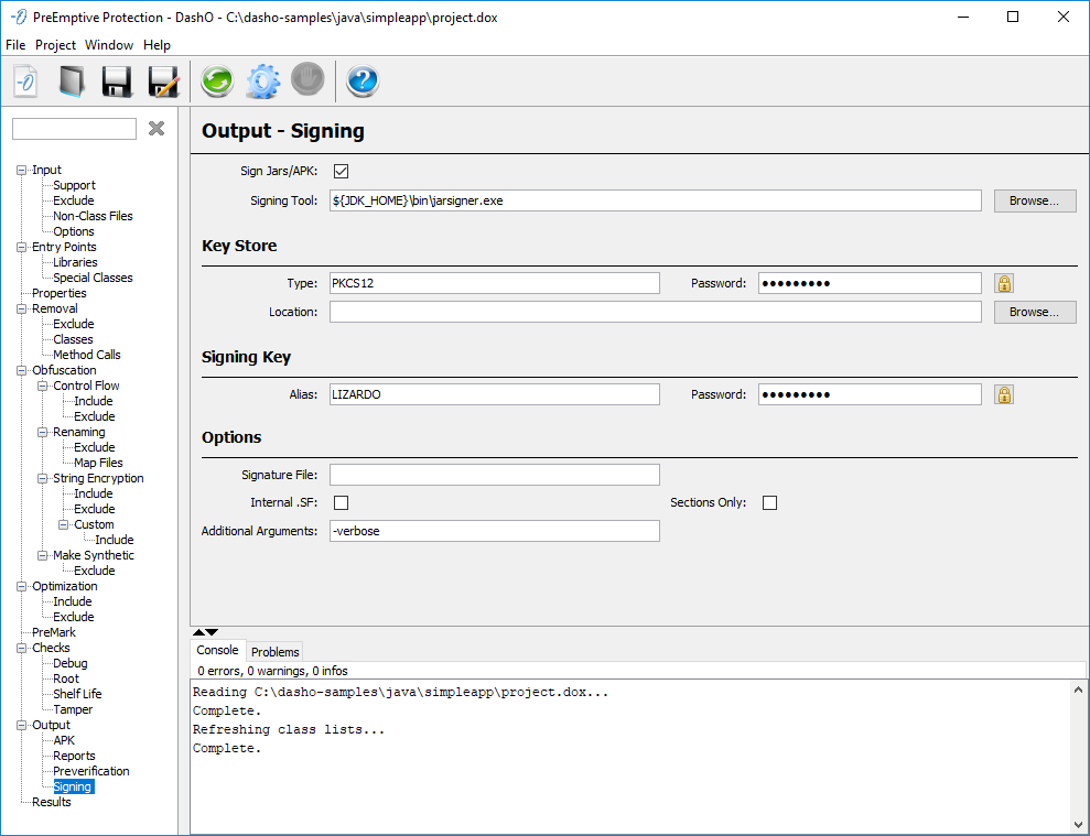 DashO が生成する出力 jar ファイルまたは APK ファイルに署名させることができます。[Sign Jars/APK]チェック ボックスをクリックすることにより、署名を有効または無効にできます。