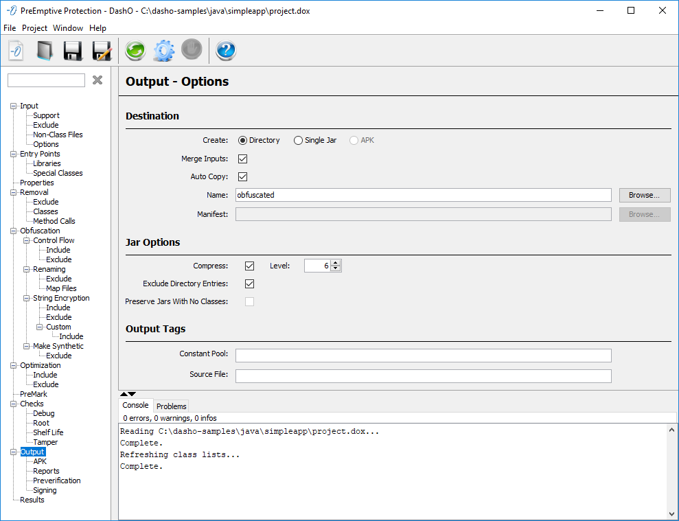 ディレクトリへ出力する際、DashO は、難読化された結果を結合して単一のディレクトリまたは jar に入れるか、または入力クラスの元のパッケージを保持することができます。