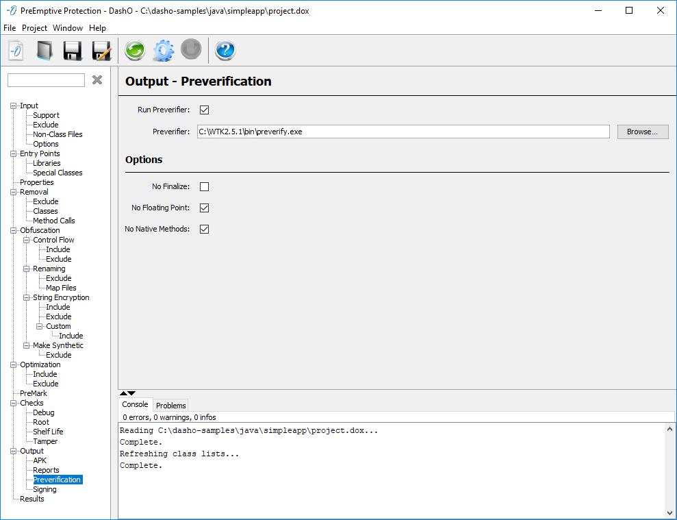 DashO がクラス ファイルの処理を完了した後、CLDC アプリケーションに対して Preverifier を実行するかどうかを選択できます。[Run Preverifier]チェック ボックスをオン/オフにすることにより、事前検証を有効または無効にできます。