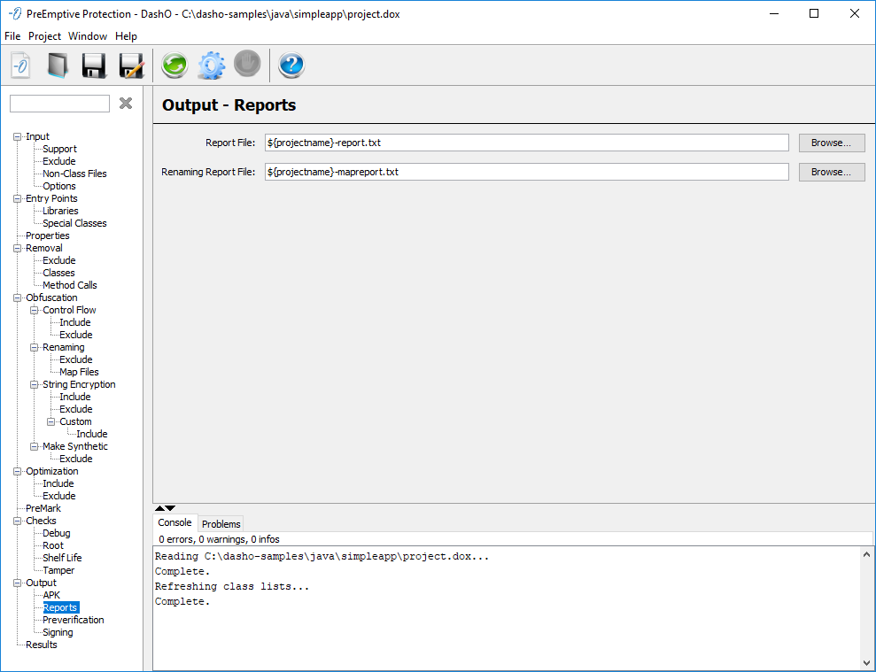 DashO によって実行された、クラスとメンバーの除去および名前の変更を概説するレポートの名前と場所を指定します。全体のメソッド/フィールド/定数プール エントリだけでなく、DashO 実行後における最終的な削減の数とパーセンテージを詳述する要約が提供されます。また、これには、リフレクションや Class.forName() 呼び出しも含め、動的に読み込まれるクラスに関する情報も含まれます。