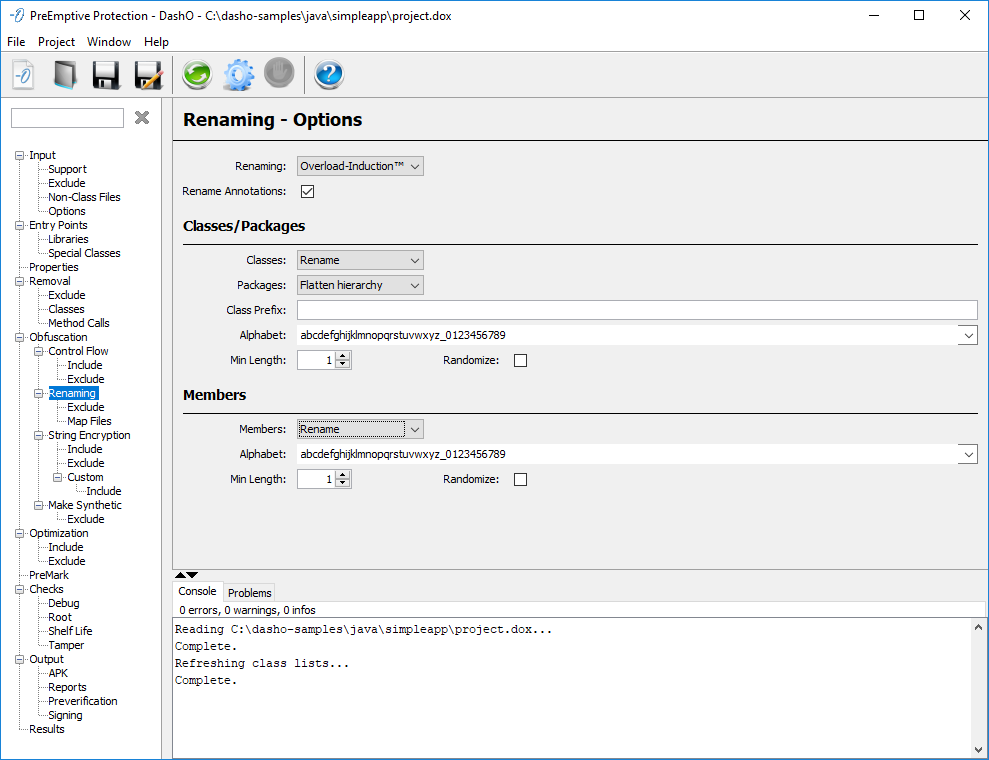 クラスの名前を変更するか、または元の名前を保持するかを選択できます。 これは、非常に粗いレベルの制御用に用意されています。対象除外を使用して、個々のクラス、パッケージ全体、または特定の条件を満たすクラスの名前を保持することができます。 [Randomize]がオンになっている場合は、利用可能な最も短い識別子の一覧の中から、新しいクラス名がランダムに割り当てられます。