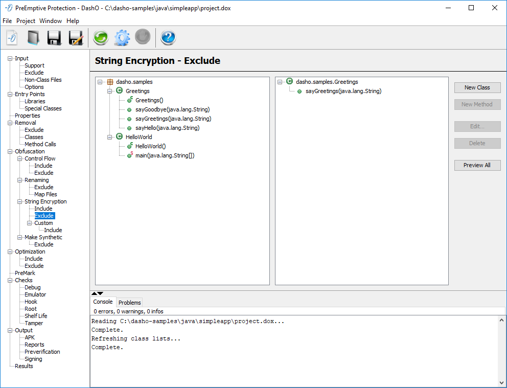 また、文字列の暗号化を使用する場合はサイズとパフォーマンスのコストがかかるため、暗号化の対象からメソッドやクラスを除外する必要がある可能性があります。 インラインがある場合は、文字列定数の文字列のすべてのコピーを暗号化するために、文字列定数を定義するクラスと、文字列定数を参照するすべてのクラスの両方を文字列の暗号化で保護してください。