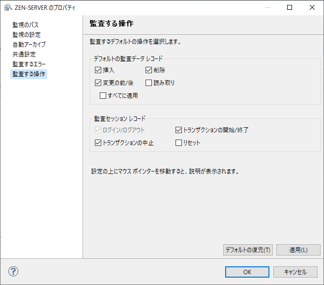監査する操作 | グローバルに監査するデフォルトの操作 | 監視する各ファイルについて、デフォルトで監査ログに入れる Microkernel エンジンのイベントを設定します。これらの設定は、ファイルごとに手動で変更することができます。 グローバルに監査する操作を参照してください。 |