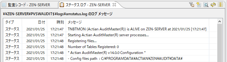 [ステータス ログ]タブには、Audit for Zen 自体によって実行されたログが表示されます。Audit for Zen の動作によって生じたステータスおよびエラー メッセージが一覧表示されます。開発者の場合は、デバッグを目的としてメッセージを収集するように構成することも可能です。