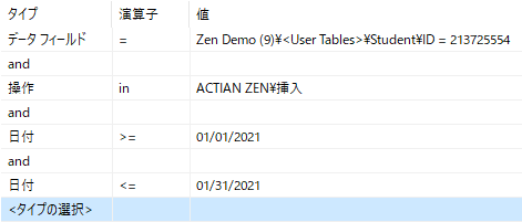 •[対象]:Zen データベース操作と選択した Zen ステータス コードのメッセージのみが、クエリ対象として選択されます。Audit for Zen の内部メッセージとデバッグ メッセージは選択されません。