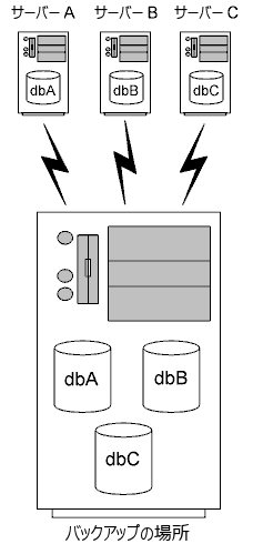 このシナリオでは、3 つのサーバー A、B、C があり、それぞれがバックアップ サーバーにネットワーク接続されています。各サーバーは、それぞれ独自のデータベース dbA、dbB、dbC を実行しています。DataExchange は各データベースのコピーをスタンバイ バックアップ サーバーに保持し、サーバー A、サーバー B、およびサーバー C で発生した変更をそれらのバックアップ コピーにレプリケートします。