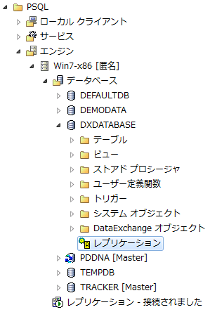 3 PSQL Control Center(PCC)を開いて PSQL エクスプローラーでエンジンの下の TrackerDB ブランチを開くこともできます。TrackerDB がデータベースとして一覧に表示され、そのレプリケーション ノードに、データベースがアクティブであることを示す A という文字が表示されていることに注目してください。