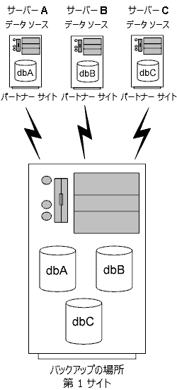 メモ:多対 1 の逆の構成では、1 つの第 1 サイトのソースが複数のパートナー サイトのバックアップにレプリケートされます。