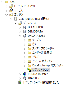 3 Control Center(ZenCC)を開いて Zen エクスプローラーでエンジンの下の TrackerDB ブランチを開くこともできます。TrackerDB がデータベースとして一覧に表示され、そのレプリケーション ノードに、データベースがアクティブであることを示す A という文字が表示されていることに注目してください。