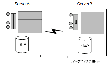 Real-Time Backup 構成では、Zen データベースのデータを、同様に Zen と DataExchange を実行しているスタンバイ バックアップ サーバーへリアルタイムにレプリケートします。システム障害時に、クライアントをスタンバイ サーバーに割り振ることができます。次の図は、一方向のレプリケーション バックアップを示しています。ServerA という名前の第 1 サイトは、バックアップ サーバーとして働く ServerB という名前のパートナー サイトにネットワーク接続されています。ServerA ではデータベース dbA を実行しています。DataExchange は dbA データベースのコピーをバックアップ サーバーに保持し、設定されているスケジュールに従って、ServerA での変更をレプリケートします。