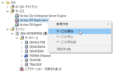 Zen 製品の種類に応じ、DataExchange レプリケーション エンジンはサービスとして、またはコンソール アプリケーションとして実行します。これは Control Center(ZenCC)からアクセスできます。このトピックでは、それぞれの場合のレプリケーション エンジンの起動および停止方法について説明します。