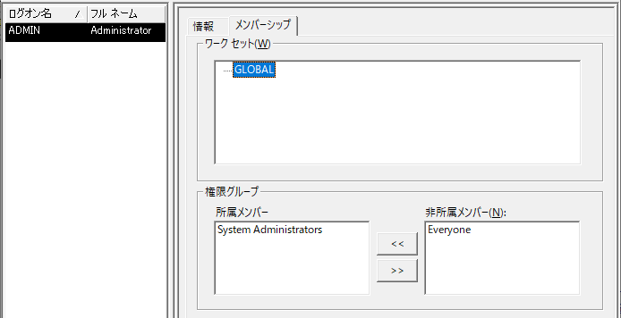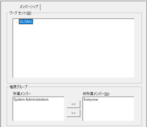 選択されたワーク セットの権限グループは、[非所属メンバー]と[所属メンバー]という 2 つのリストに区分けされます。選択したユーザーは[所属メンバー]リストにエントリされているグループのメンバーです。