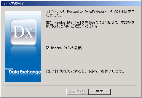 •[Readme ファイルの表示]オプションのチェックをオフにした場合は、DataExchange のインストール処理が終了します。後から読む場合は、Pervasive DataExchange の readme.htm ファイルを開きます。