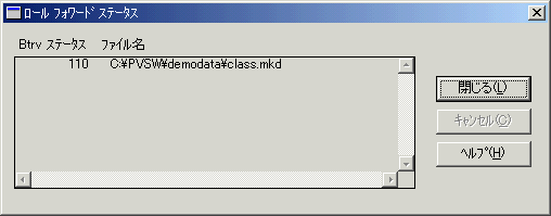 処理されたファイルは、リスト ボックスに追加され、ファイル名、およびロール フォワード オペレーションから返される Pervasive PSQL ステータス コードが表示されます。