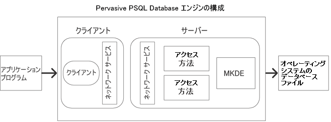 下図は、オペレーティング システムでのアプリケーション プログラムからデータベース ファイルへのフローを示しています。データベース エンジンはアプリケーション プログラムとデータ ファイルの間に存在します。