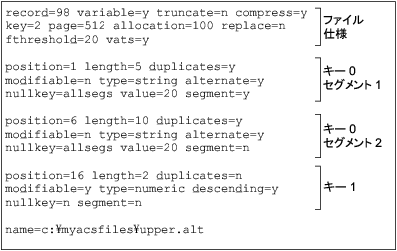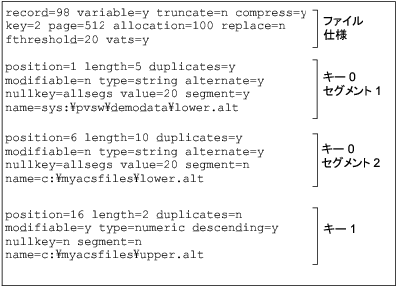 このセクションにあるディスクリプション ファイルのサンプルは、データ ファイルの説明です。このデータ ファイルのページ サイズは 512 バイトで、キーは 2 つです。レコードの固定長部分は 98 バイトです。ファイルで可変長レコードは使用可能ですが、ブランク トランケーションは使用できません。
