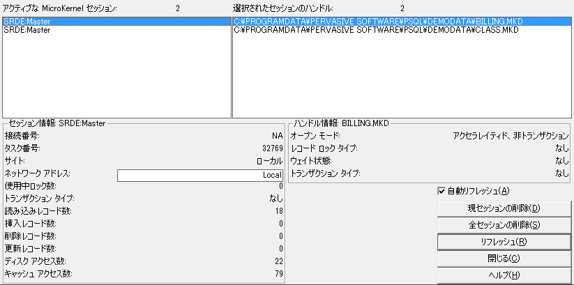ハンドル数 | アクティブ ハンドルの数。MicroKernel は、ユーザーがファイルを開くたびにハンドルを作成します。1 つのセッションが同じファイルに対していくつかのハンドルを持つことができます。 |