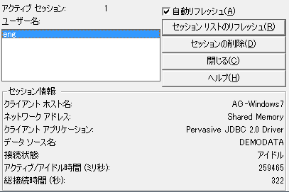 セッション数 | データベース エンジンによって使用されているセッション数。「使用されているセッション数」は端的に「セッション数」ともいいます。この最大値は、使用許諾契約書に従って許可される最大セッション数を示します。この最大値は、「セッショ数の制限値」ともいいます。 セッション数は、トランザクショナル インターフェイスまたはリレーショナル インターフェイスを介して確立されたすべてのセッションを示します。 セッション数に関するメッセージは、Pervasive PSQL のさまざまなログ リポジトリに記録されます。『Pervasive PSQL User's Guide』のPervasive PSQL メッセージ ログを参照してください。 データベース エンジンは、Pervasive PSQL システム ファイル、メタデータ ファイル、dbnames.cfg およびデフォルトのシステム データベースへのアクセスなど、独自の内部処理用にさまざまなセッションを使用します。これらの内部セッションについてはセッション数を消費しません。 |