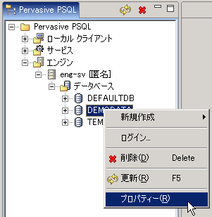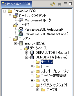 2 Pervasive PSQL エクスプローラーで、まずエンジン ノードを、次にデータベース ノードを展開します。