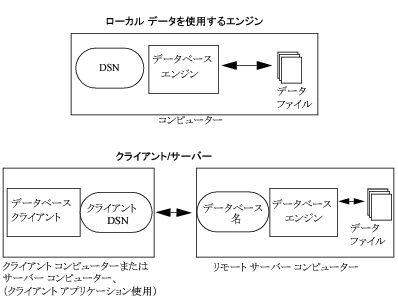 •コンピューターにワークグループ エンジンをインストールしている場合は、ローカルまたはリモート データベースに対し、そのコンピューター上で DSN を定義することができます。DSN の作成方法については、