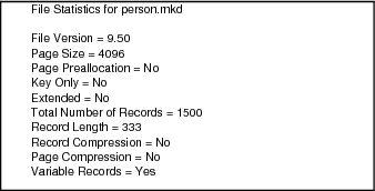 この例では、ファイル PATIENTS.DTA が、8.0 形式のファイルであることを表しています(バージョン番号は、そのファイル形式を読むことができる Btrieve の一番古いバージョン)。ファイルには、2,048 バイトのページ サイズが指定されており、プリアロケート ページはありません。これは、キー オンリー ファイルでも拡張ファイルでもありません。