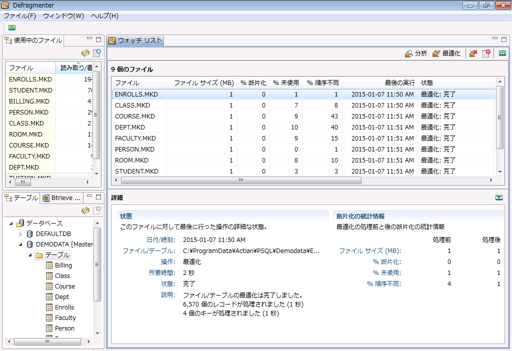 ファイルの分析 ![]() | [ウォッチ リスト]タブで選択した項目について断片化の統計情報を収集して表示します。 |