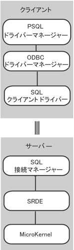 SQL 接続マネージャーは、最大 2000 までの同時接続をサポートしており、ODBC ドライバー マネージャーを使用してリレーショナル エンジン(SRDE)を呼び出します。エンジンは MicroKernel の上に置かれます。