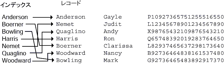 前の例では、ラスト ネーム キーのインデックスがラスト ネーム値をソートし、レコードがデータ ファイル内のどこにあるかを示すポインターを持っています。