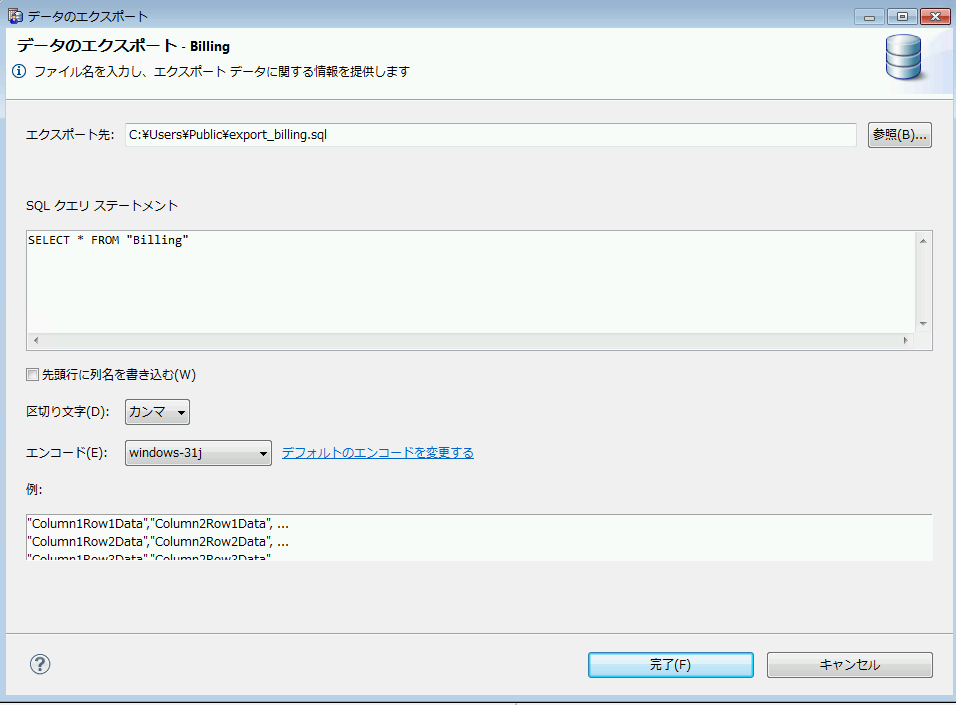 データのエクスポートで、ファイルのエンコードの変更や、デフォルトのエンコード設定が可能になりました。[例:]領域に、リテラル データのプレビュー機能はありません。指定のファイル名、エンコード、および選択したその他のオプション([先頭行に列名を書き込む]や[区切り文字])を基に、エクスポートされるデータの見え方の例を表示します。この[例:]領域の内容は、ファイルが選択され、エンコードやオプションが変更されると更新されます。