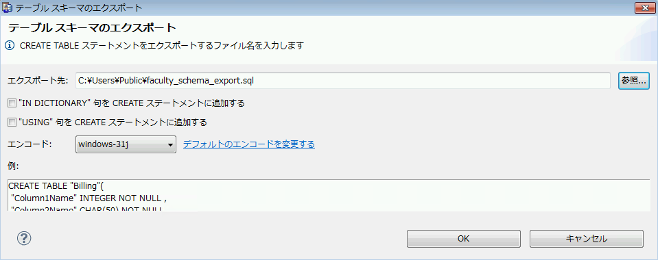 スキーマのエクスポートで、ファイルのエンコードの変更や、デフォルトのエンコード設定が可能になりました[例:]領域に、リテラル スキーマのプレビュー機能はありません。選択したオプションを基に、エクスポートされるテーブル スキーマの見え方の例:を表示します。この[例:]領域の内容は、ファイルが選択され、エンコードやオプションが変更されると更新されます。