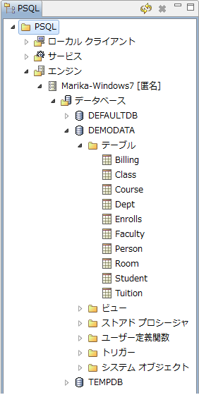 図 19 PSQL エクスプローラー に表示されるオブジェクトの例