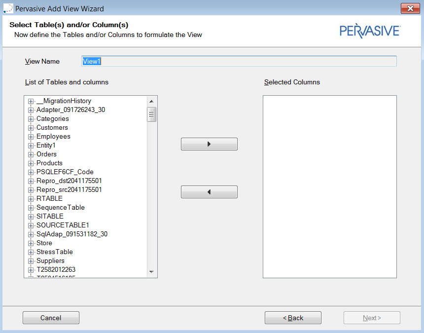 7 [List of Tables and columns]リスト ボックスでビューを構成するテーブルまたは列を選択し、それを[Selected Columns]列に移動します。