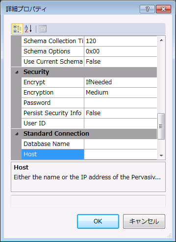 [詳細プロパティ]ダイアログ ボックスの値を変更するには、対象フィールドで新しい値を選択するか、値を入力して Enter キーを押します。この値が接続文字列に追加され、プロパティの説明の下にあるフィールドに表示されます。デフォルトの値を受け入れる場合は、接続文字列フィールドを変更せずそのままにしておきます。必要な変更を加えたら、[OK]をクリックして[接続の追加]ウィンドウに戻ります。