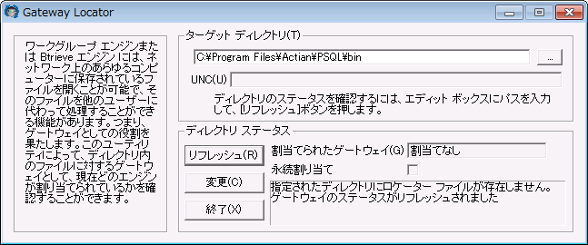 このユーティリティを使用すれば、特定のディレクトリにあるデータ ファイルのゲートウェイとして使うワークグループ エンジンをユーザーが指定したり変更することができます。Gateway Locator ユーティリティは、PSQL ワークグループ エンジンでのみ使用することができます。