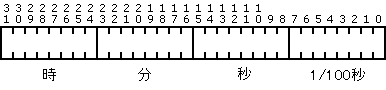 TIME キー タイプは、内部的に 4 バイト値として格納されます。100 分の 1 秒、秒、分、時の値が、それぞれ 1 バイトのバイナリ形式で格納されます。MicroKernel は、100 分の 1 秒の値を最初のバイトに、それ以降のバイトにそれぞれ、秒、分、時の値を置きます。