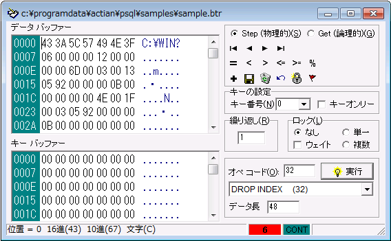 オペレーション リスト | Btrieve オペレーションとそのコードをリストします。デフォルトは Open(0)です。実行するオペレーションの頭文字を入力すれば、リスト内ですぐに移動ができます。 | |