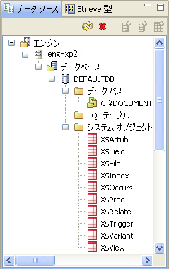 Btrieve ファイルの構造を XML ファイルへエクスポートする | データ パス名の下にある Btrieve ファイル名を右クリックします。 [ Btrieve スキーマのエクスポート]  をクリックします。 | Btrieve ファイルのデータ自体はエクスポートされません。 |