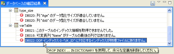 DDF Builder では、既存のテーブル定義で問題を検出して変更するときは自動的に定義エラー ビューが開きます。このウィンドウを閉じた場合、再度このウィンドウを開けば変更を見直すことができます。