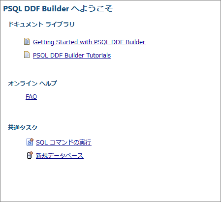 [ヘルプ]>[PSQL ドキュメント ライブラリ]を選択することもできます。DDF Builder と PSQL Control Center(PCC)は同じコンポーネント(SQL Editor など)を共有しているので、DDF Builder 内で開くオンライン ヘルプであっても PSQL の他の機能に関する情報が表示されることもあります。