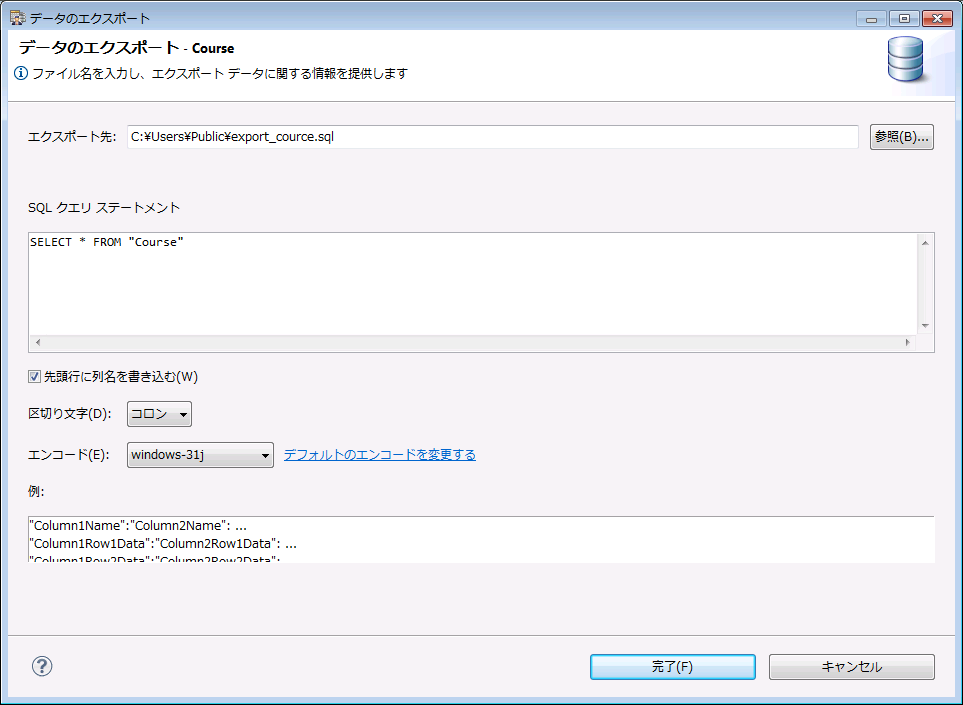 次の図は、DEMODETA サンプル データベースに含まれる Course テーブルのデータをエクスポートするための設定例です。[先頭行に列名を書き込む]オプションが選択され、[区切り文字]は "コロン" が設定されています。