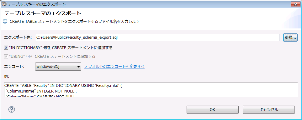 次の図は、DEMODETA サンプル データベースに含まれる Faculty テーブルのスキーマをエクスポートするための設定例です。['IN DICTIONARY' 句を CREATE ステートメントに追加する]オプションが選択され、[例:]領域に IN DICTIONARY 句が含まれていることに留意してください。